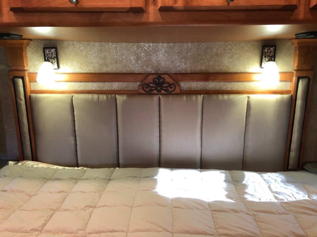 Small camper bedrooms can feel like sleeping in a coffin, but a faux or fabric headboard adds instant warmth and comfort. Think plush, upholstered panels or even a woven tapestry screwed into the wall behind your bed.