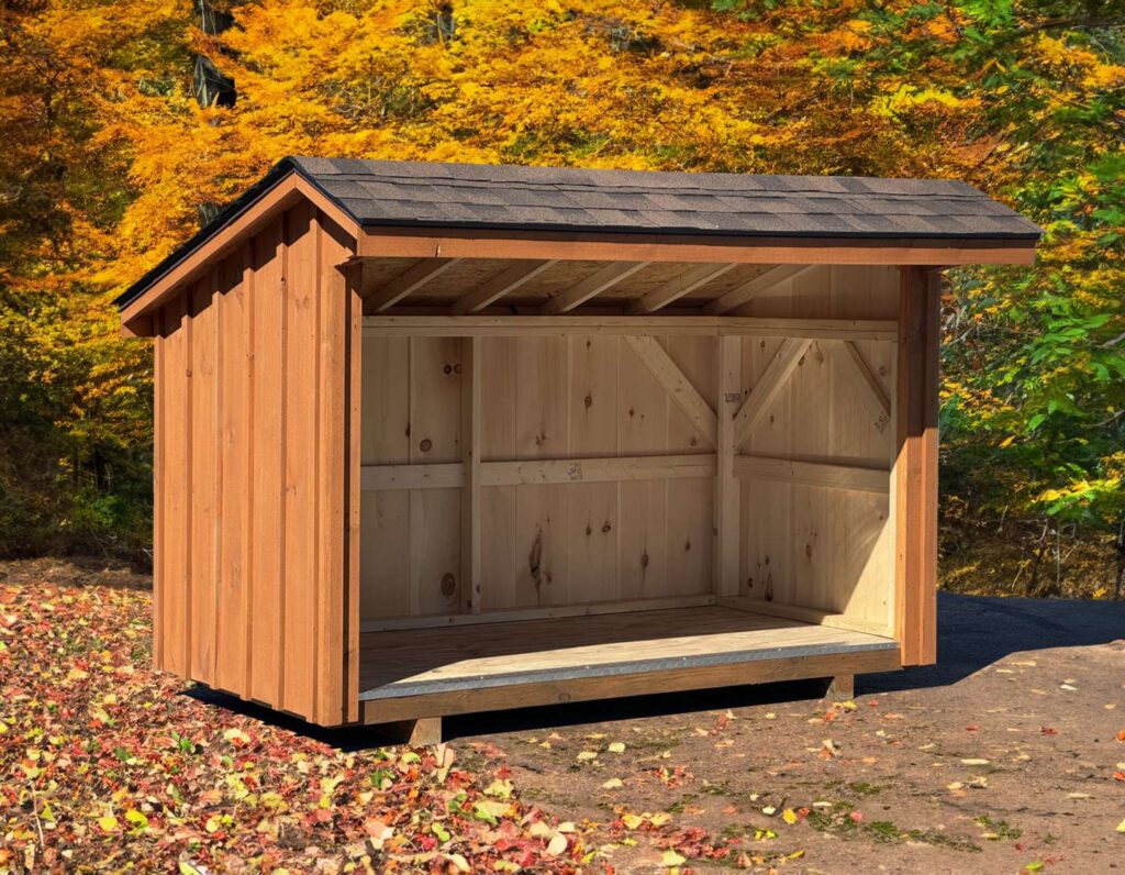 Weatherproof it with asphalt shingles and seal gaps with caulk to keep tools and firewood dry. Size it to fit essentials-shovels, axes, and a stack of logs-without eating up your lot.